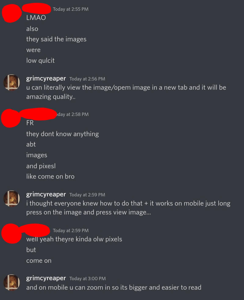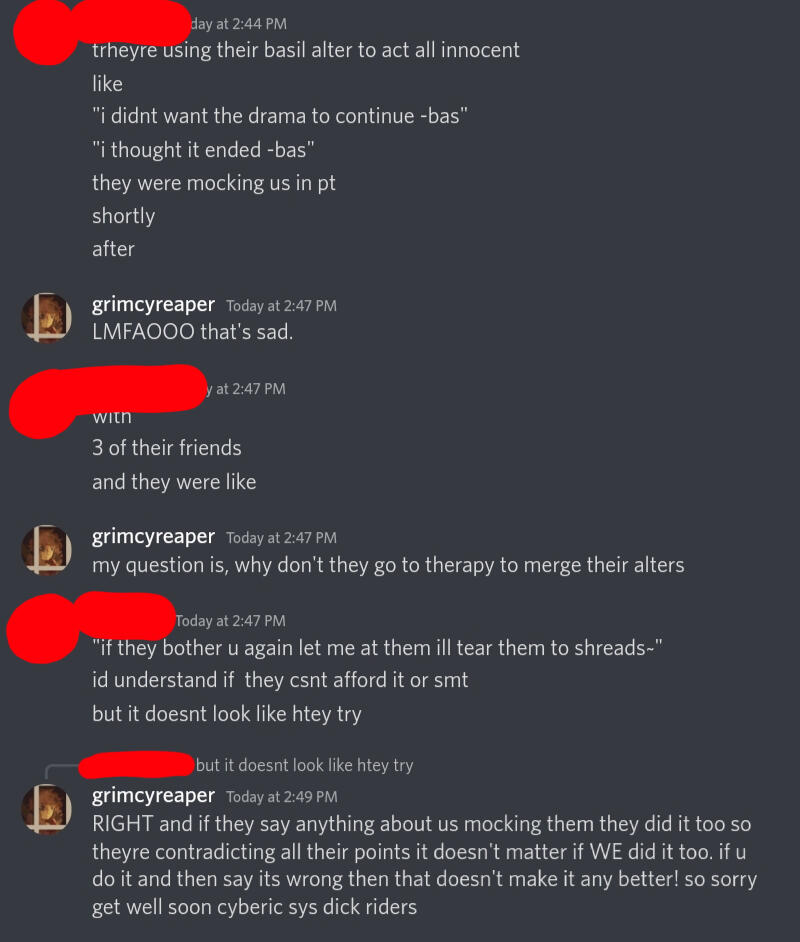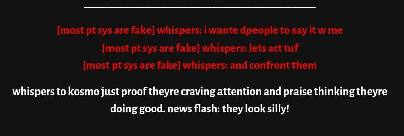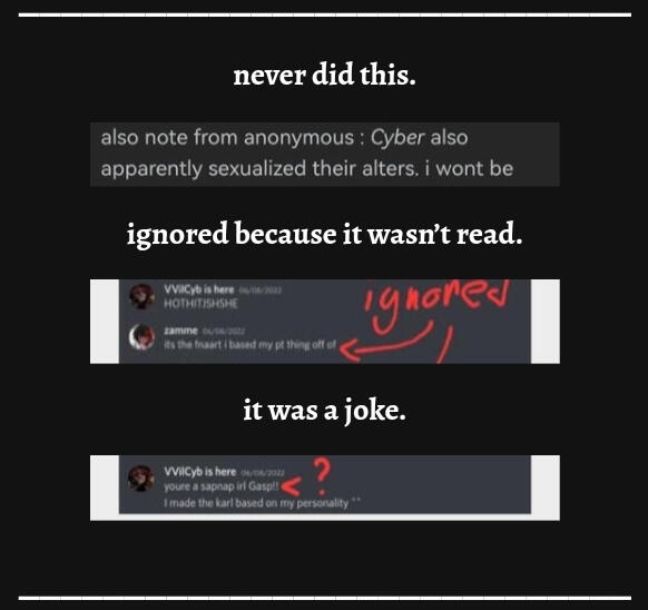 look at what you guys are doing tho? 0 room to talk dawg. + cyberic got mad at me for sitting with someone on a pixel mlp rp game i could see if it was irl but it's not. please seek therapyi am not seeking praise or validation are u projecting on to me help what!