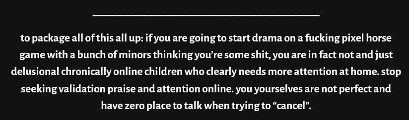 so would you like me to give them the age range they used and people think they're a pedophile? idrc about u leaking mine but you are literally contradicting your points you made when you did that.++ the second part is so stupid because you're supposed to do research before saying shit like that + they even told me 2 put irl in my pony name way back, got no proof tho so take with a grain of salt